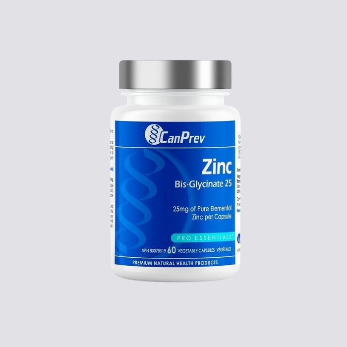 - CanPrev’s Zinc Bis-Glycinate 25 is the preferred form of zinc due to its superior absorption and gentleness. Daily intake is important, as we excrete what we don’t use or absorb. The mineral zinc plays an important role in several bodily functions including proper wound healing, taste, vision, cognitive health, immunity, blood sugar support, and normal glandular function. It’s also an essential component of the body’s antioxidant enzymes, superoxide dismutase (SOD) and glutathione peroxidase.
